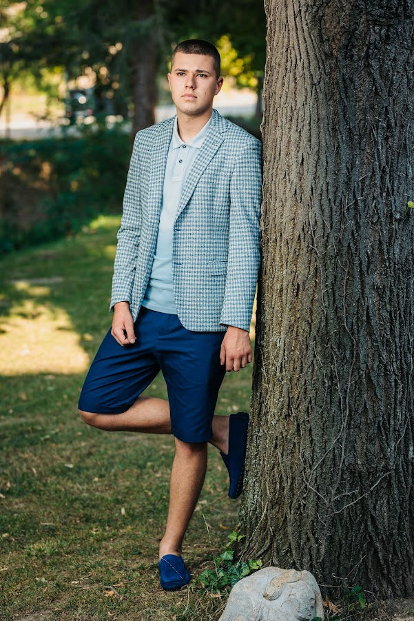 Вталената кройка оформя силуета и придава изискан, съвременен вид. Светлосиният кариран мотив носи свежест и лекота – идеални за пролетно-летния сезон. Сакото се комбинира отлично както с риза или поло, така и с тениска за по-непринуден стил, както и с елегантен панталон за по-официална визия.
