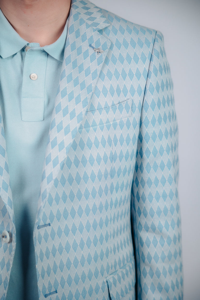 Това изискано мъжко сако в светлосин нюанс с фин геометричен мотив на ромбове придава визуална дълбочина и стилен релеф на материята. Балансираният десен съчетава класическа форма с модерно излъчване, създавайки отличителна и подредена визия.